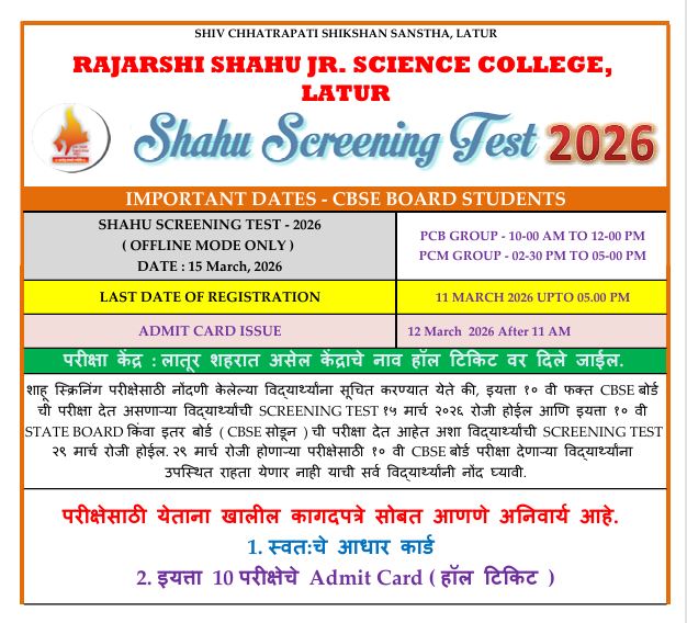 "शाहू स्क्रिनिंग परीक्षेसाठी नोंदणी केलेल्या विद्यार्थ्यांना सूचित करण्यात येते की, इयत्ता १० वी फक्त CBSE बोर्ड ची परीक्षा देत असणाऱ्या विद्यार्थ्यांची SCREENING TEST १५ मार्च २०२६ रोजी होईल आणि इयत्ता १० वी STATE BOARD किंवा इतर बोर्ड ( CBSE सोडून)ची परीक्षा देत आहेत अशा विद्यार्थ्यांची SCREENING TEST २९ मार्च रोजी होईल. २९ मार्च रोजी होणाऱ्या परीक्षेसाठी १० वी CBSE बोर्ड परीक्षा देणाऱ्या विद्यार्थ्यांना उपस्थित राहता येणार नाही याची सर्व विद्यार्थ्यांनी नोंद घ्यावी.